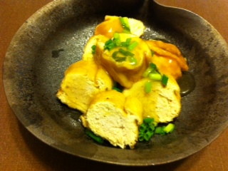 これね、油揚げの中に鶏ひき肉を詰めて、普通に煮たあとそのお出汁にとろみをつけて餡かけにしたもの