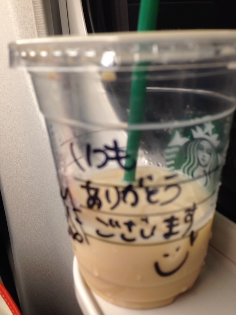なんかほっこり 2014年07月27日 日曜日なのに、名古屋へ日帰り~名古屋駅のスタバではいつも買ってたけど、今日はこんなメッセージが…飲むまで気づかなかった。発車までギリギリだったので急がせちゃったのに…なんか疲れも吹っ飛ぶくらい嬉しかった…頑張って帰ろうっと… ... 続きを読む 日曜日なのに、名古屋へ日帰り~名古屋駅のスタバではいつも買ってたけど、今日はこんなメッセージが…飲むまで気づかなかった。発車までギリギリだったので急がせちゃったのに…なんか疲れも吹っ飛ぶくらい嬉しかった…頑張って帰ろうっと…