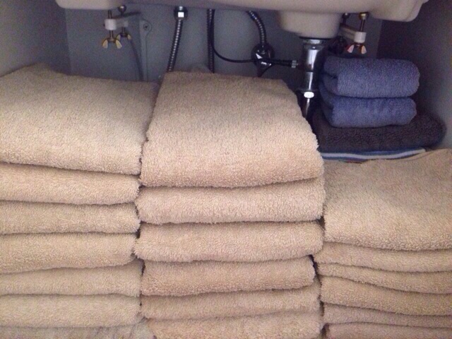 我が家のタオル事情 2015年12月07日 寒いですね~~。暑いより寒い方が好きですが、朝布団から出られませんさて突然ですが、皆様はタオルってどのくらいお持ちですか?我が家は洗面台の下に入るだけ……って決めているのですが、これがなかなかそうはいかなくって困ってますまだ洗濯中のタオルもありまして ... 続きを読む 寒いですね~~。暑いより寒い方が好きですが、朝布団から出られませんさて突然ですが、皆様はタオルってどのくらいお持ちですか?我が家は洗面台の下に入るだけ……って決めているのですが、これがなかなかそうはいかなくって困ってますまだ洗濯中のタオルもありまして、全部だと入りきりません↓と言うのも、私はフワフワで柔らかいタオルが好き。主人はゴワゴワで固めなタオルが好き。つまり……そろそろヘタレてきたなぁって思い、捨てたいタオルを主人が一番好きなんです。だから……捨てられないんです。写真でもわかるのですが、向かって左側と真ん中は同じメーカーのタオルなのですが膨らみ度が違うんです!それくらいゴワゴワでペシャンコなのに捨てられずに、ただ増えていくだけ……困ったものです……何枚位が適正枚数なのでしょうか?そして、タオルの捨て時っていつ?私の中に?マークが浮かびます。皆様はどうしてます?
