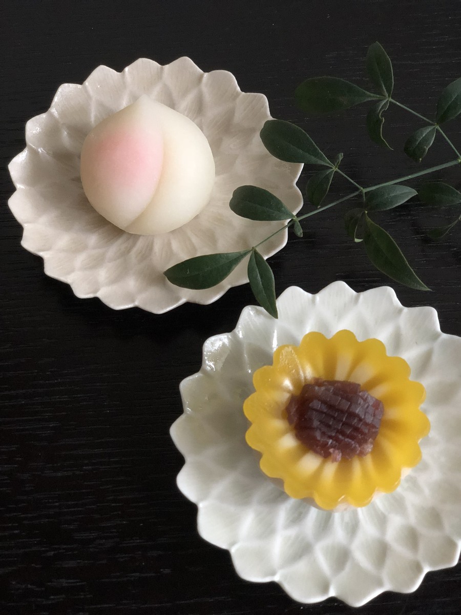 ヒマワリの練り切りと白桃の求肥♪