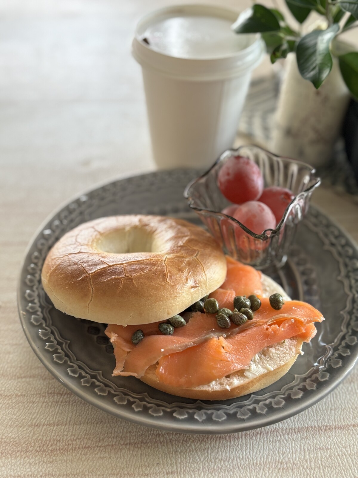 ベーグル2個とコーヒーで300円で販売されていたので、ブルサンチーズとサーモンを挟んでベーグルサンドに…