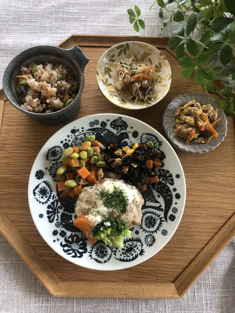 おかずとご飯がセットになっていて、ご飯もひじきご飯だったり枝豆ご飯だったりと工夫されてる(*ˊ˘ˋ*)